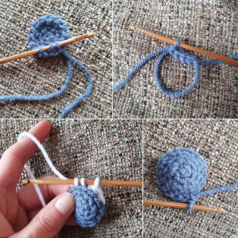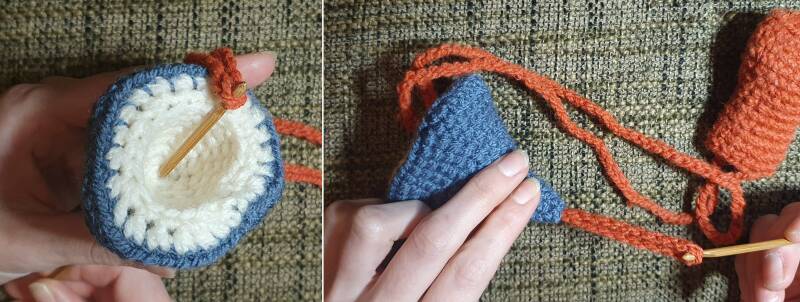 Using your crochet hook, pull the cord of the stem through the top of the outside and inside of the hat to complete the pouch.