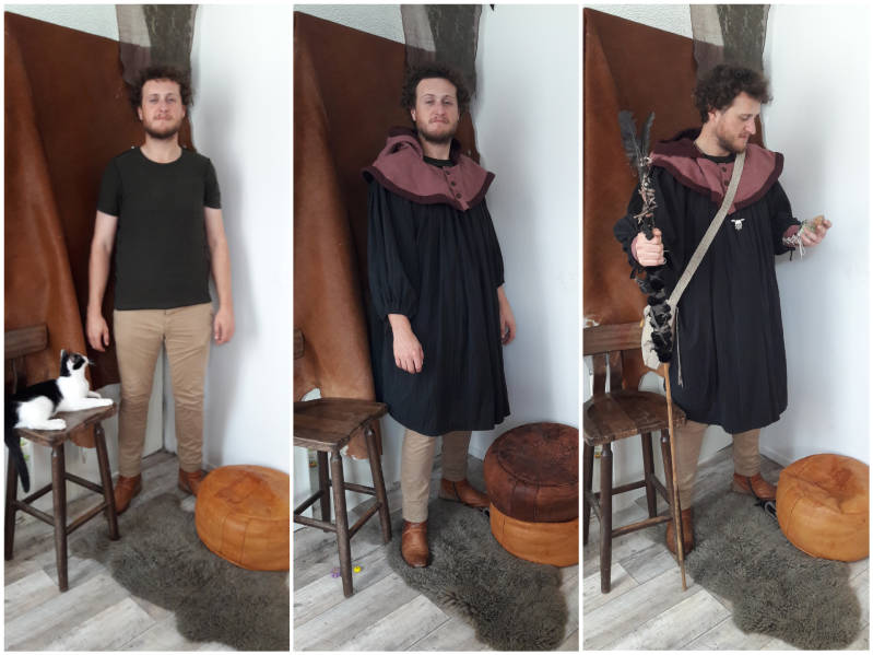 Opbouw van een kostuum: Neutrale kleding, een kostuum kledingstuk en afgemaakt met accessoires en props.